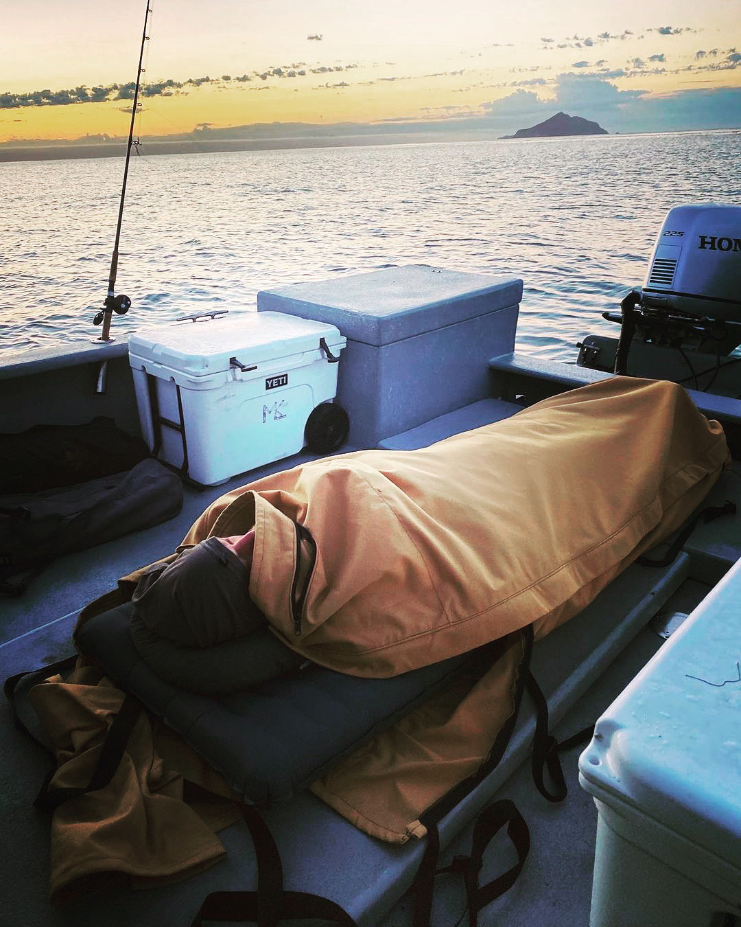 "Been a customer of bullkelp bedrolls since day one and love their products! I’ve been using my bedrolls to sleep on the deck of my boat. They are comfy and keep me dry and warm from the marine dew at night after a long day of fishing and diving. "